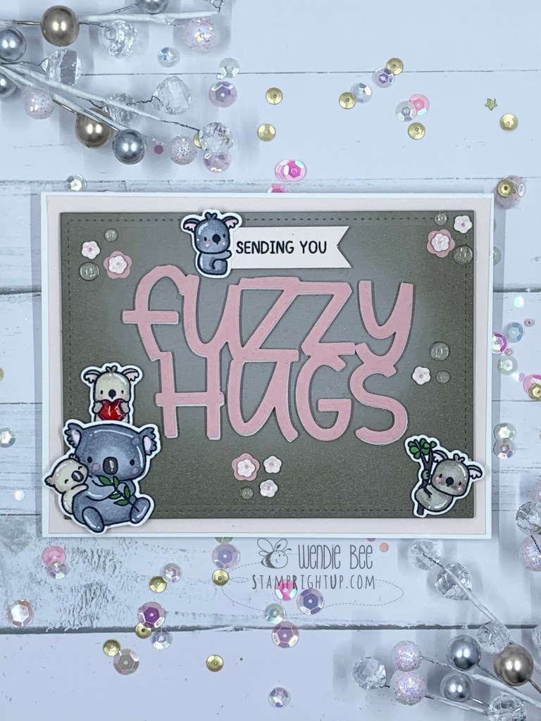 I used the Mama Elephant Warm Fuzzy Hugs big word die, modifies to snip off the word Warm. Die cut once with fun foam, then again with a flocked card stock, giving it a fuzzy feeling. It was just impossible to capture on camera.