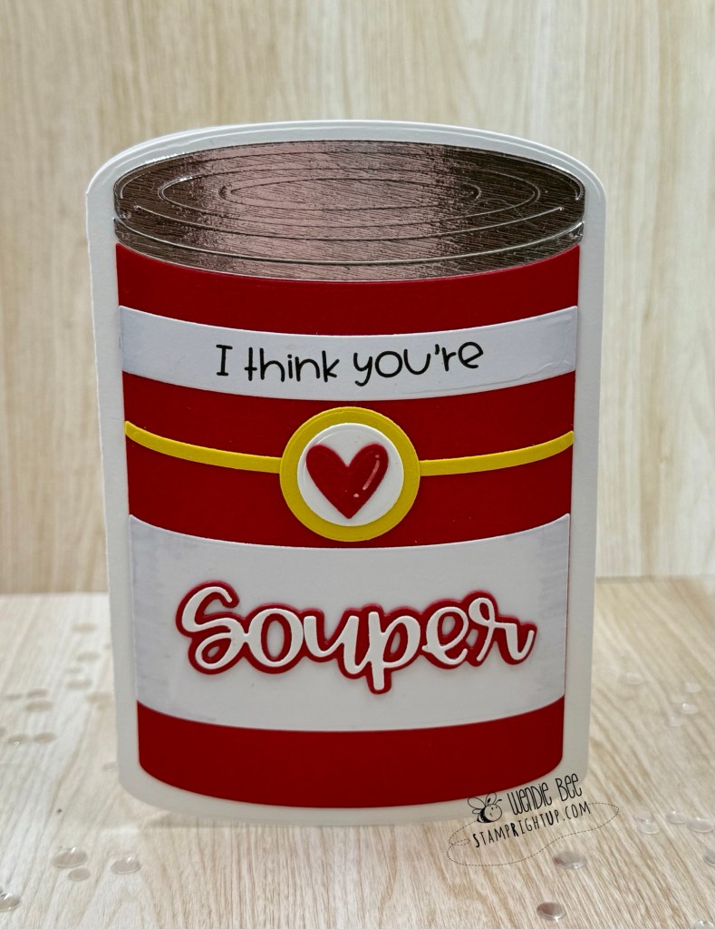 This clever die set builds a full soup can card base, complete with embossed metallic “lid” details and bold wrap-around stripes reminiscent of a certain iconic pantry staple. I layered mine with classic red and white cardstock for a clean, bold look and added the included sentiment die and heart embellishment for a pop of sweetness.